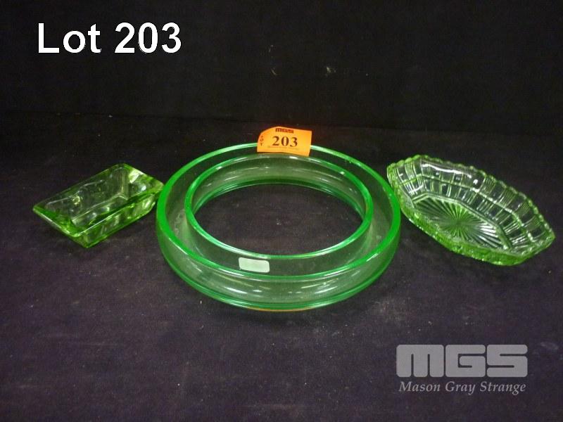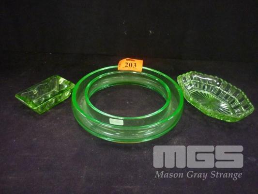 LARGE URANIUM GLASS FLOWER FROG, GREEN DEPRESSION GLASS, ASHTRAY & BOWL