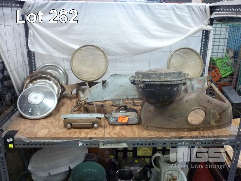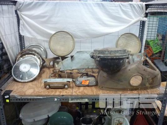 ASSORTED VINTAGE CAR PARTS INCLUDING HOLDER, CHEVROLET, ETC