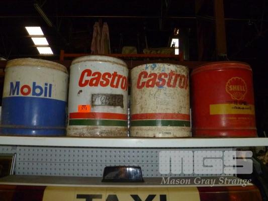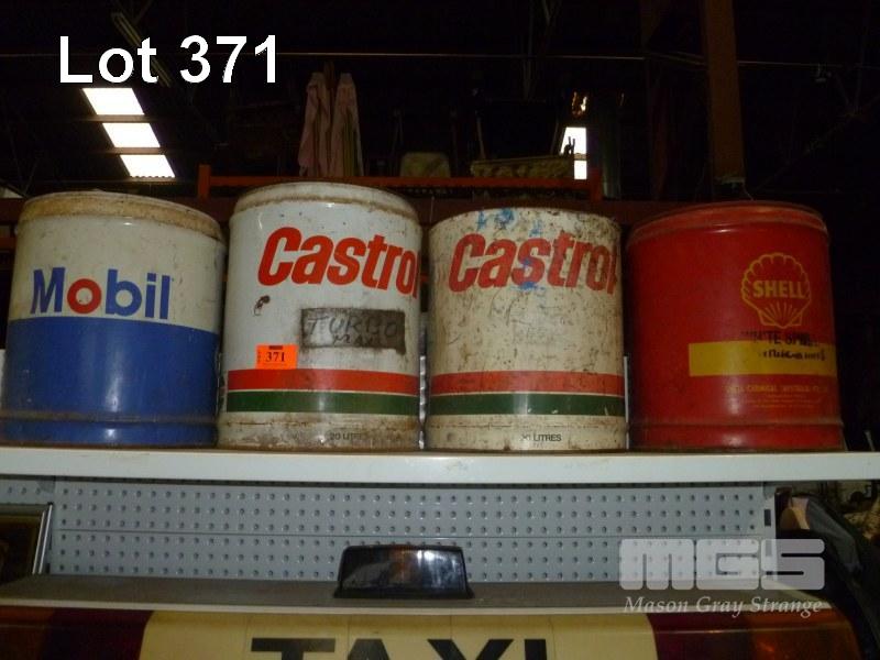 4 X 20 LITRE, PETRONALIA TINS, INC; MOBIL, SHELL & 2 X CASTROL (1 X TOP CUT OUT)
