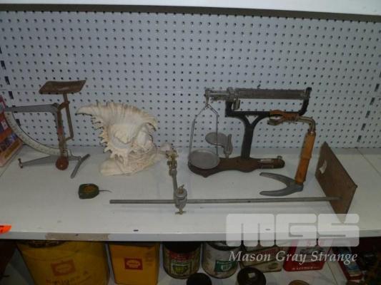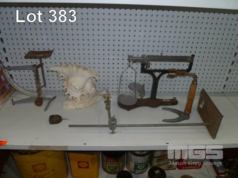 RETRO SHELL TABLE LAMP, 2 x VINTAGE SCALES, 2 x VINTAGE LABORATORY STANDS