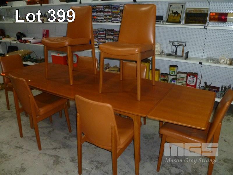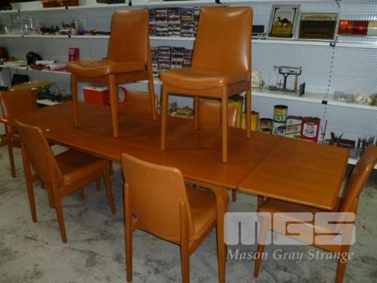 TEAK 9 PIECE NOBLETT DINING SUITE, EXTENSION TABLE & 8 x BROWN LEATHER DINING CHAIRS