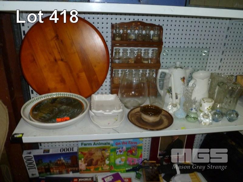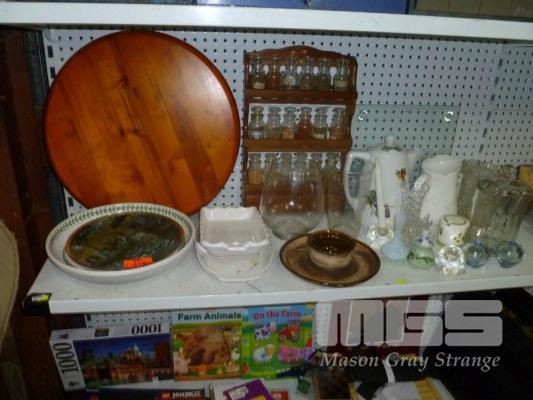 TIMBER SPICE RACK, PITCHERS, TABLEWARE, ETC