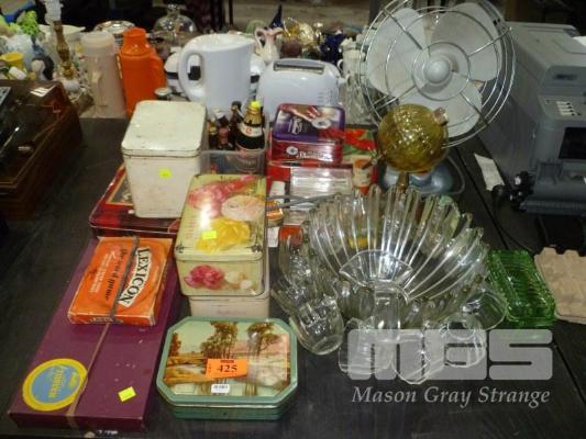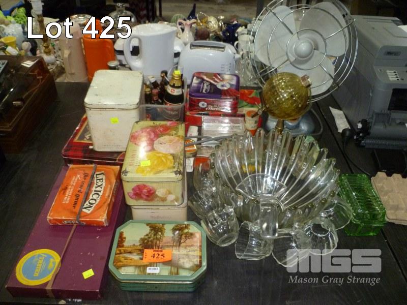 ASSORTED TINS, MINIATURE ALCOHOL BOTTLES, GAMES, FAN & PUNCH BOWL