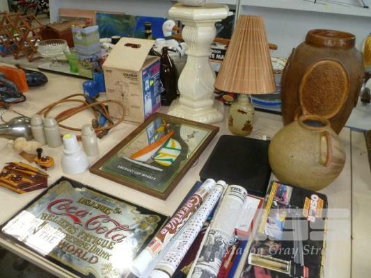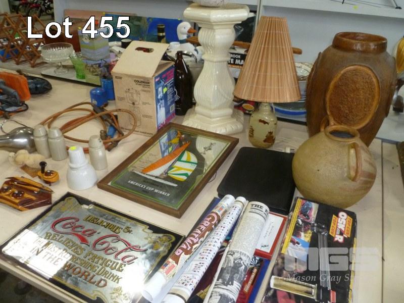 ASSORTED HOUSEHOLD & CAMPING ITEMS, POTTERY VASES, LPG LAMP, STOVE BLOW LAMP, TABLE LAMP & BAR MIRRORS