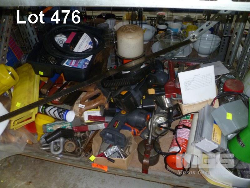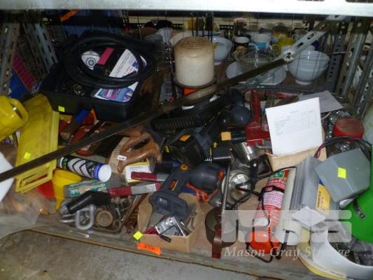 ASSORTED TOOLS, CORDLESS DRILL, INVERTER, FIRE EXTINGUISHER, 1 x BAY