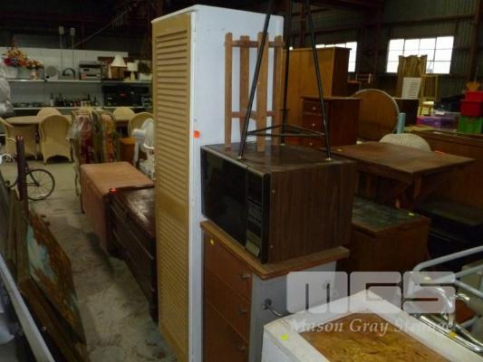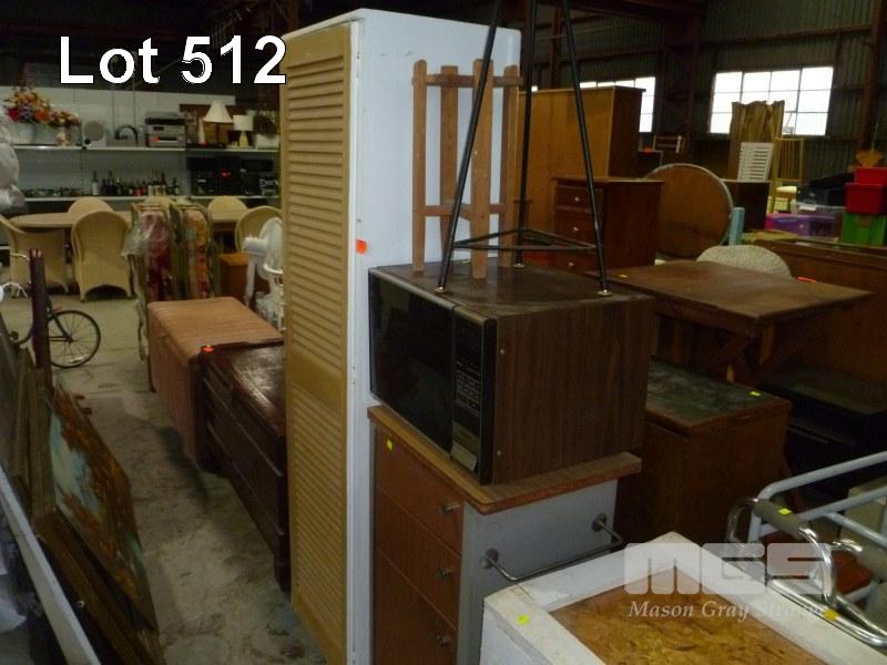 NATIONAL MICROWAVE & 5 x PIECES FURNITURE, LINEN PRESS, MOBILE METAL CABINET, TIMBER CRATE, SIDE TABLE & STOOL