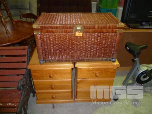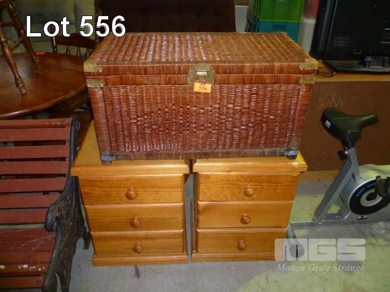 PAIR OF PINE BEDSIDE CABINETS, 3 DRAWER & CANE BLANKET BOX