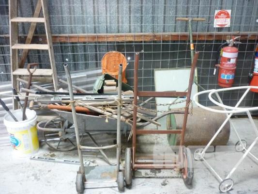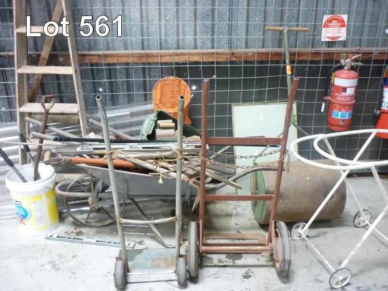 TURF ROLLER, WHEEL BARROW, ASSORTED TOOLS, SACK TRUCKS, ETC