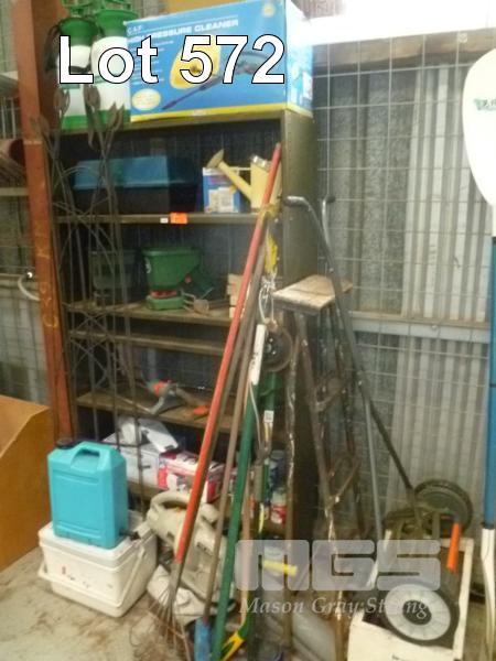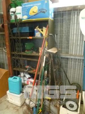 SHED LOT, SHELVES, PAINT, TOOLS, BLOWER JAC & PRESSURE CLEANER ETC, PUSH MOWER