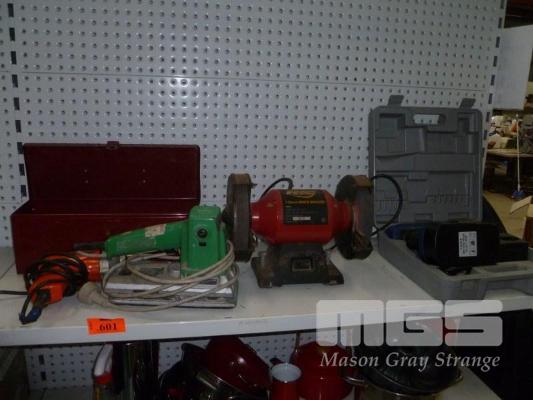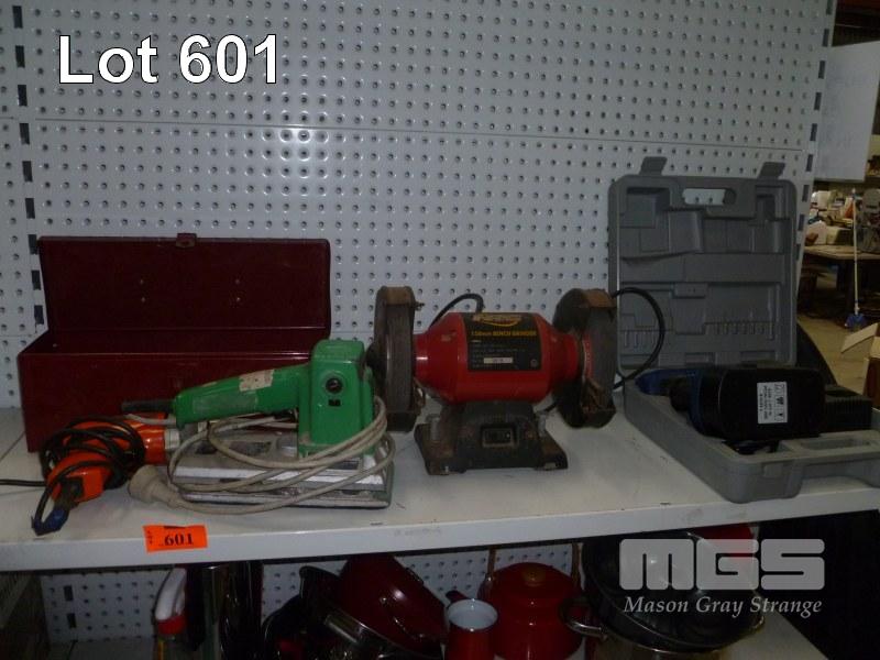 ASSORTED ELECTRICAL TOOLS, DRILL, BENCH GRINDER, CORDLESS DRILL, HITACHI SANDER & TOOL BOX