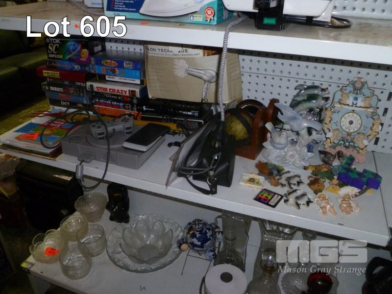 PLAYSTATION CONSOLE, VHS TAPES, HAIR DRYER, ETC