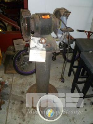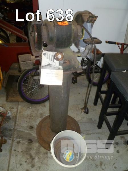 GMF 8 INCH BENCH GRINDER ON FABRICATED STEEL PEDESTAL BASE, 240 V & ASSORTED GRIND WHEELS