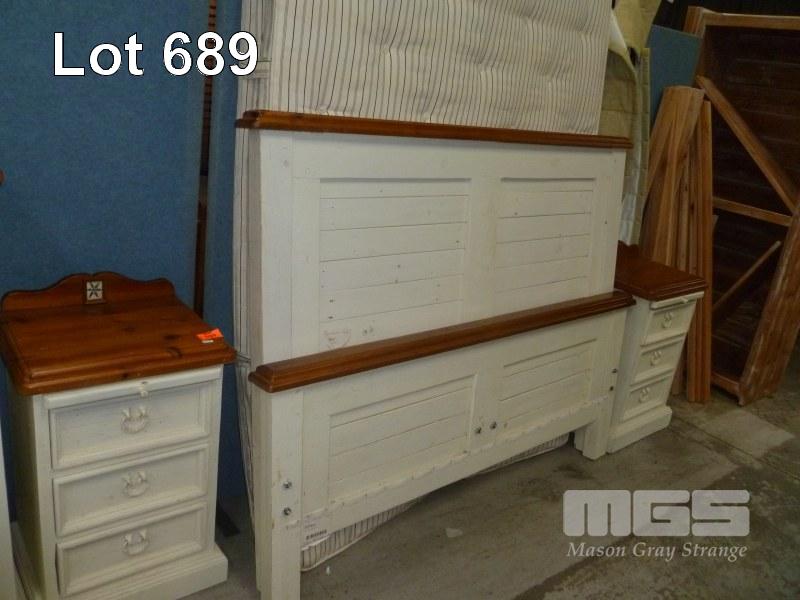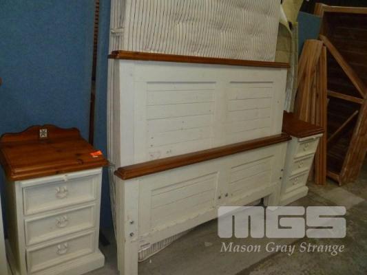 PINE & WHITE WASH PAINTED BEDROOM SUITE, DOUBLE BED WITH MATTRESS & PAIR BEDSIDE CABINETS, 3 DRAWER