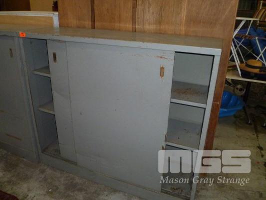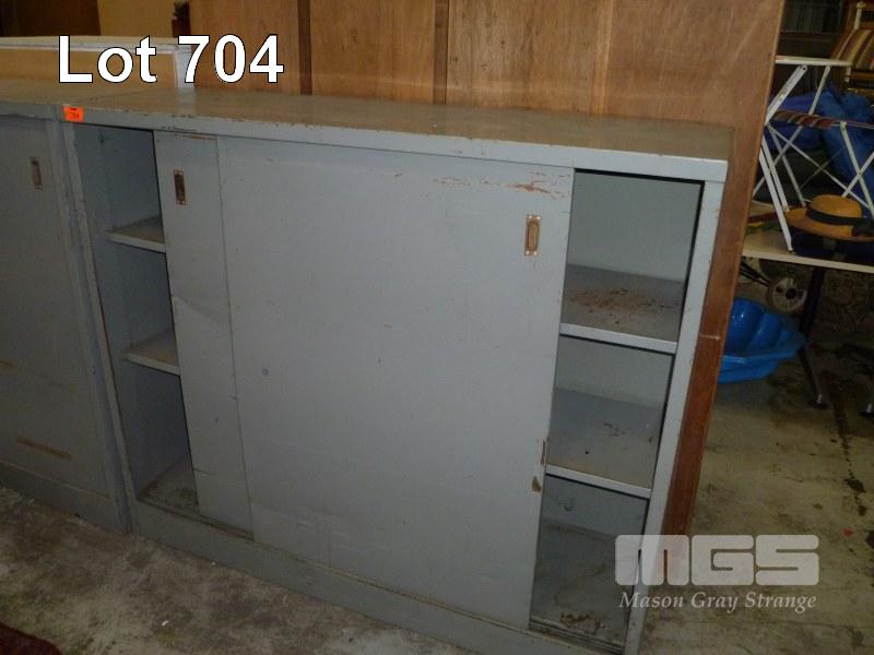 GREY METAL STORAGE CABINET, 2 x SLIDING DOORS