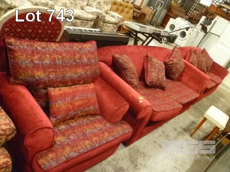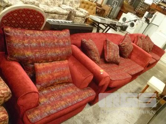 RED FABRIC, ROLL ARM, 3 PIECE LOUNGE SUITE, SINGLE SEATER, 2 & 3 SEATER WITH SCATTER CUSHIONS