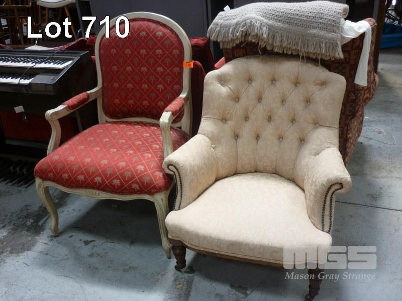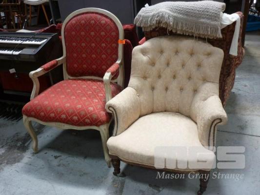 WHITE WASH TIMBER, RED FABRIC ARM CHAIR & BEIGE PATTERN, DEEP BUTTON, BRASS CASTORS ARM CHAIR
