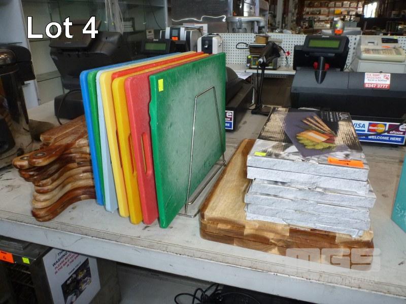 8 x PVC CUTTING BOARDS, RACK & 6 x SLATE CHEESE BOARDS