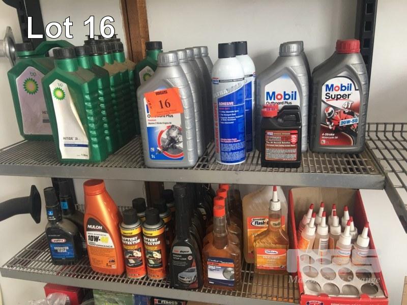 2 x SHELVES:- ASSORTED AUTO FLUIDS, OUTBOARD OILS, 2 STROKE, MOTOR BIKE OIL, COOLING SYSTEM REPAIR, STOP SMOKE & LEAK ETC
