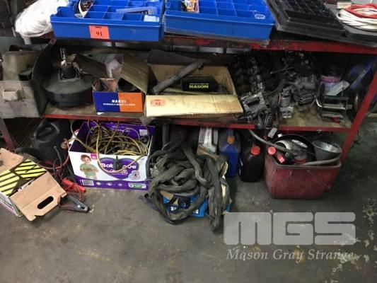 CONTENTS UNDER WORKSHOP BENCH, EXTENSION CORDS, SLINGS, HAND WINCH, DRUM PUMPS, 20 LITRE, ASSORTED AUTOMOTIVE PARTS