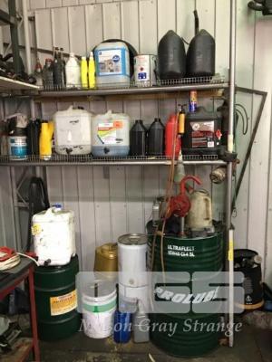 CONTENTS OR RACK INCLUDING QUANTITY OF ASSORTED AUTO FLUIDS, COOLANT, OILS, GREASE, ENGINE FLUSH, TRANS FLUID, JERRY CANS, 44 GALLON DRUM PUMP, ETC