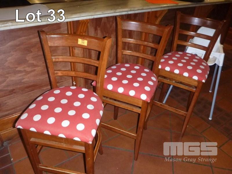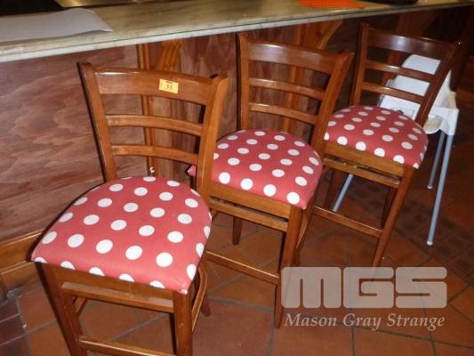 3 x BAR STOOLS, STAINED TIMBER, PATTERN FABRIC SEAT & HIGH CHAIR