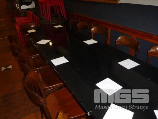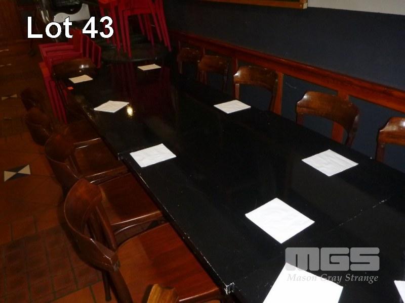 7 x CAFE TABLES, EACH 85 x 85cm, BLACK STAIN TIMBER TOP, PEDESTAL BASE