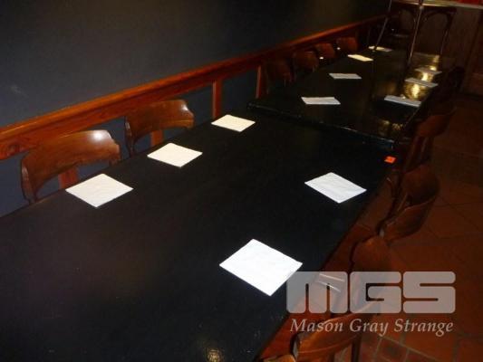 2 x CAFE TABLES, 240 x 80cm & 170 x 85cm, BLACK STAIN TIMBER TOP, PEDESTAL BASE