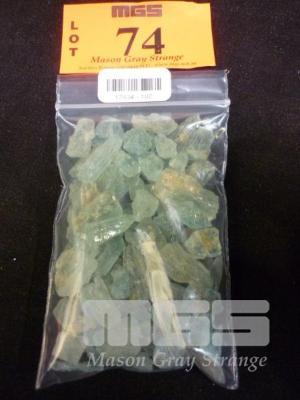BAG OF UNCUT LIGHT BLUE GEMSTONES, TESTED AS AQUAMARINE, 55 GRAMS