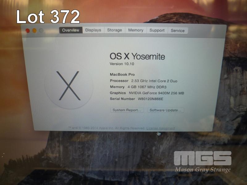 LAPTOP, APPLE MACBOOK PRO (A1278), CORE 2 DUO P8700 @ 2.53GHz, 4GB DDR3 RAM, 250GB SATA HDD, DVD-RW, 13.3" WIDESCREEN (1280x800), 256MB NVIDIA GEFORCE 9400M VIDEO, Wi-Fi, MAC OS 10.10 INSTALLED & POWER SUPPLY S/N:W80120N866E