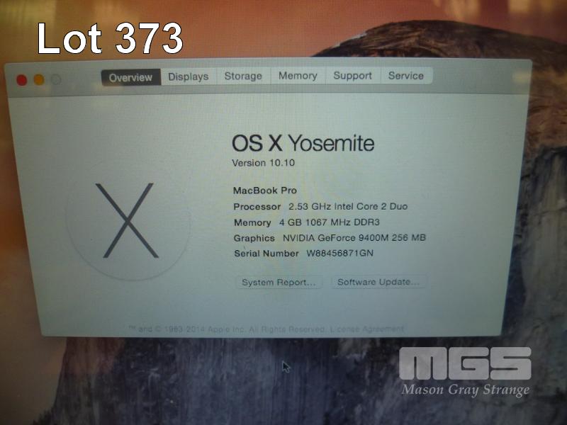 LAPTOP, APPLE MACBOOK PRO (A1297), CORE 2 DUO T9400 @ 2.53GHz, 4GB DDR3 RAM, 320GB SATA HDD, DVD-RW, 15.4" WIDESCREEN (1440x900), 256MB NVIDIA GEFORCE 9400M VIDEO, Wi-Fi, MAC OS 10.10 INSTALLED & POWER SUPPLY S/N:W88456871GN