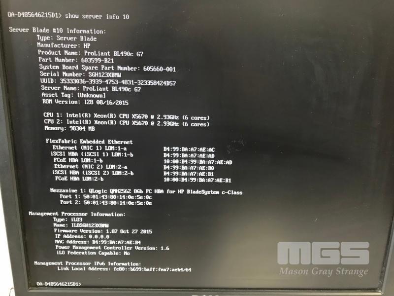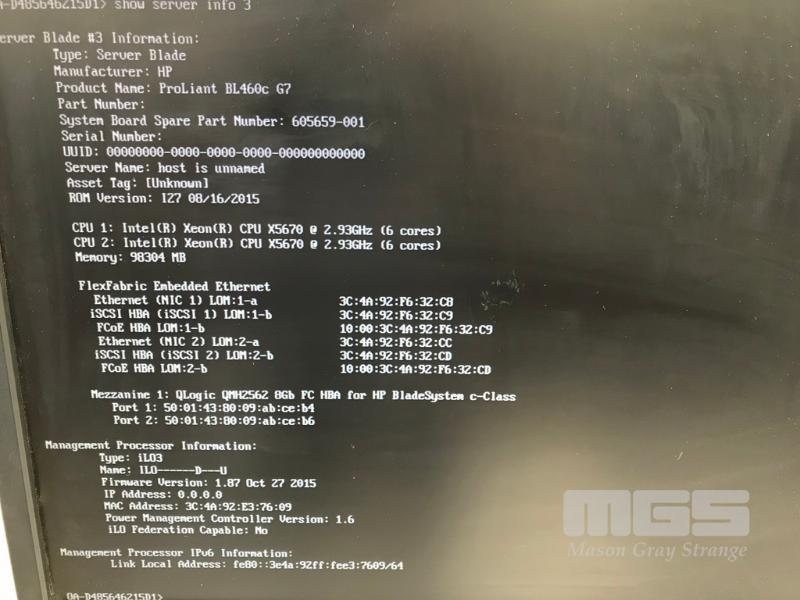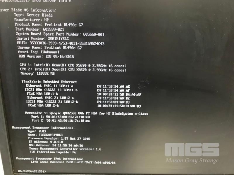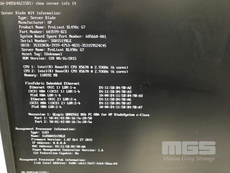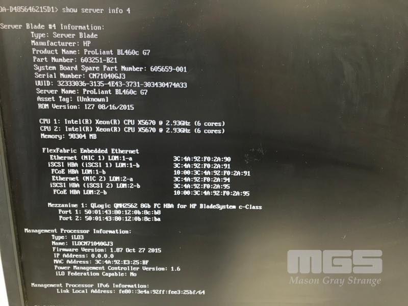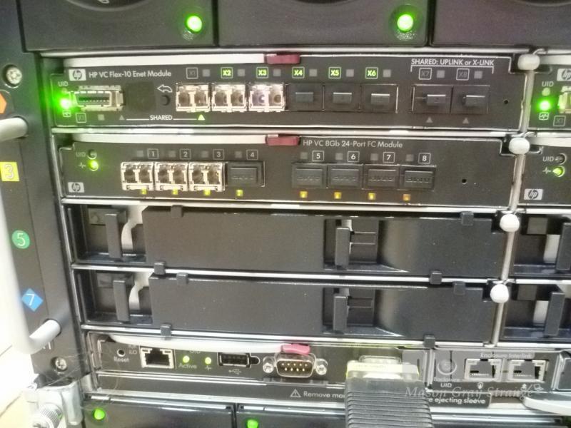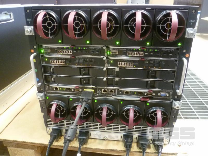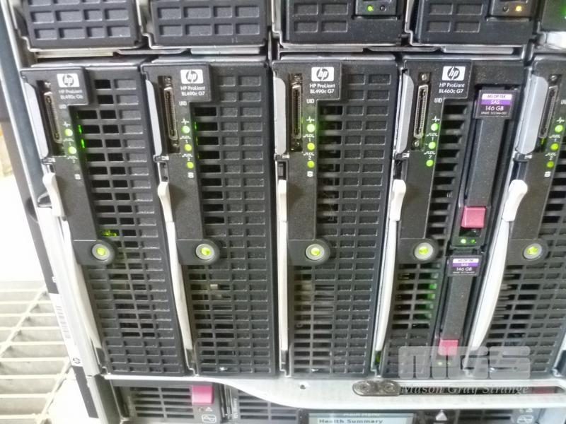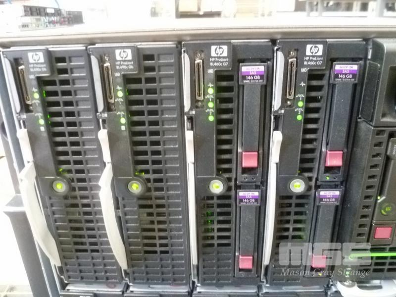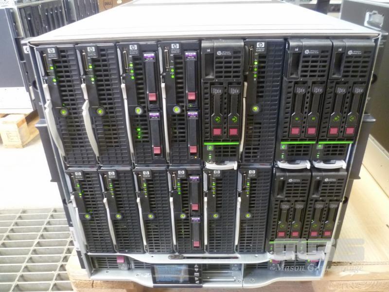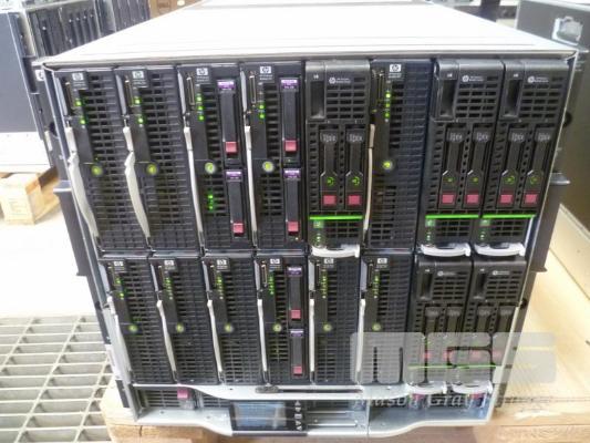 HP BLADESYSTEM c7000 ENCLOSURE G2 (507015-B21) WITH 16 x HP PROLIANT BLADE SERVERS 2 x HP VC 8Gb 24-PORT FC MODULES 2 x HP VC FLEX-10 ENET MODULES WITH RAILS & 15A EXTENSION CABLES #1 - HP PROLIANT BL490c G6, 2 x XEON X5670 @ 2.93GHz, 96GB RAM #2 - HP PROLIANT BL490c G6, 2 x XEON X5670 @ 2.93GHz, 96GB RAM #3 - HP PROLIANT BL460c G7, 2 x XEON X5670 @ 2.93GHz, 96GB RAM, 2 x 146GB HDD #4 - HP PROLIANT BL460c G7, 2 x XEON X5670 @ 2.93GHz, 96GB RAM, 2 x 146GB HDD #5 - HP PROLIANT BL460c GEN8, 2 x XEON E5-2670 @ 2.6GHz, 128GB RAM, 2 x 146GB HDD #6 - HP PROLIANT BL490c G7, 2 x XEON X5670 @ 2.93GHz, 108GB RAM #7 - HP PROLIANT BL460c GEN8, 2 x XEON E5-2670 @ 2.6GHz, 128GB RAM, 2 x 146GB HDD #8 - HP PROLIANT BL460c GEN8, 2 x XEON E5-2670 @ 2.6GHz, 128GB RAM, 2 x 146GB HDD #9 - HP PROLIANT BL490c G6, 2 x XEON X5670 @ 2.93GHz, 96GB RAM #10 - HP PROLIANT BL490c G7, 2 x XEON X5670 @ 2.93GHz, 96GB RAM #11 - HP PROLIANT BL490c G7, 2 x XEON X5670 @ 2.93GHz, 96GB RAM #12 - HP PROLIANT BL460c G7, 2 x XEON X5670 @ 2.93GHz, 96GB RAM, 2 x 146GB HDD #13 - HP PROLIANT BL490c G7, 2 x XEON X5670 @ 2.93GHz, 96GB RAM #14 - HP PROLIANT BL490c G7, 2 x XEON X5670 @ 2.93GHz, 108GB RAM #15 - HP PROLIANT BL460c GEN8, 2 x XEON E5-2670 @ 2.6GHz, 128GB RAM, 2 x 146GB HDD #16 - HP PROLIANT BL460c GEN8, 2 x XEON E5-2670 @ 2.6GHz, 128GB RAM, 2 x 146GB HDD EACH WITH QLOGIC QMH2562 / QMH2572 8Gb FC HBA (GEN8s WITH HP FLEXFABRIC 10Gb 2-PORT 554FLB ADAPTER) S/N:SGH043XMP0