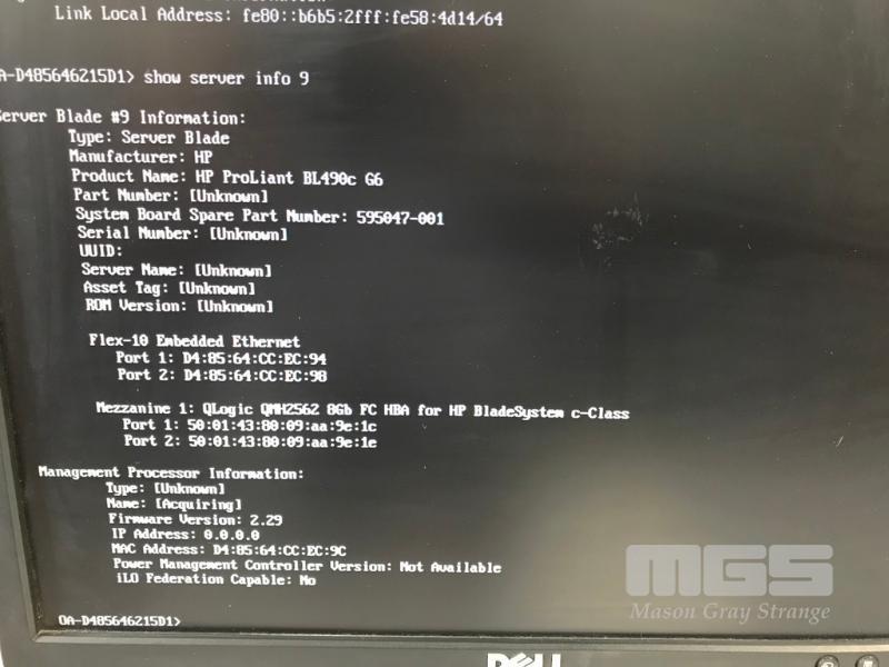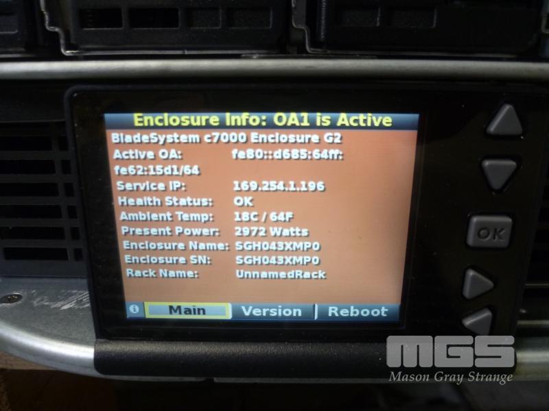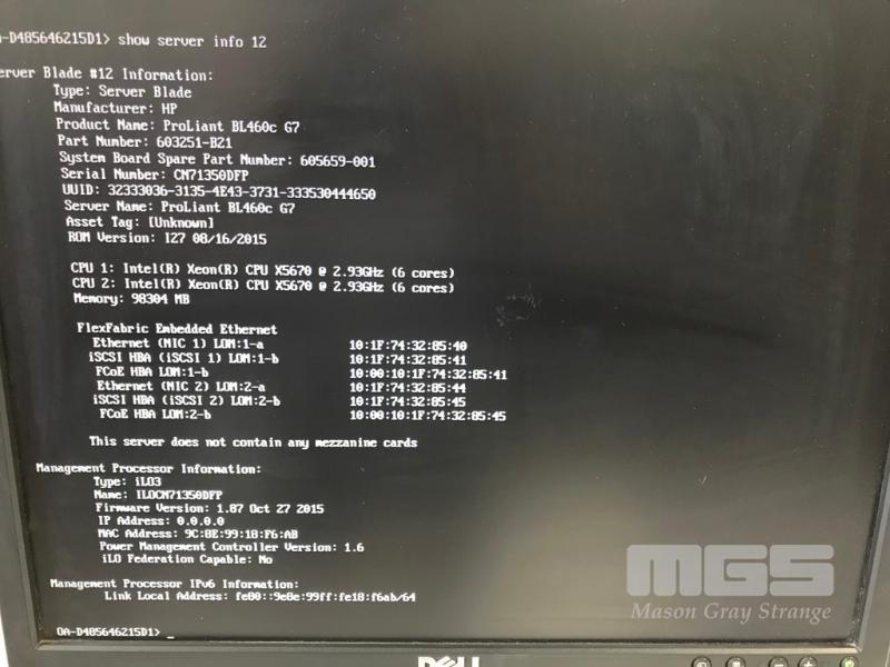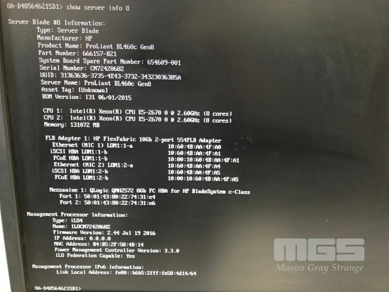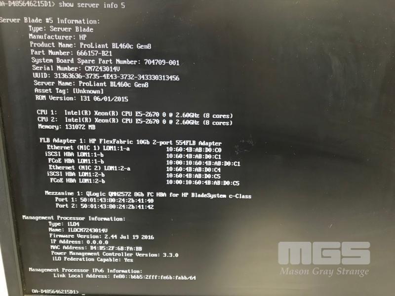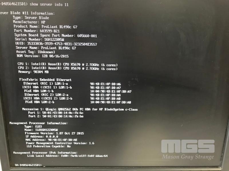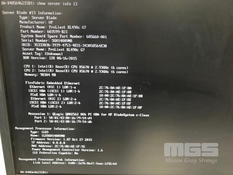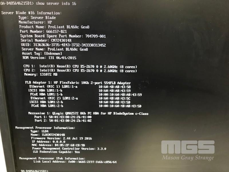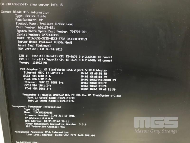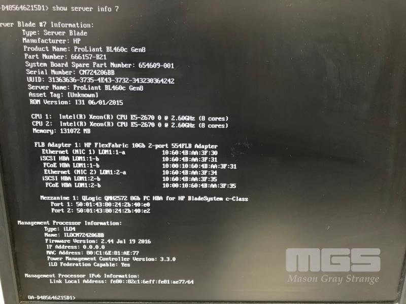 HP BLADESYSTEM c7000 ENCLOSURE G2 (507015-B21) WITH 16 x HP PROLIANT BLADE SERVERS 2 x HP VC 8Gb 24-PORT FC MODULES 2 x HP VC FLEX-10 ENET MODULES WITH RAILS & 15A EXTENSION CABLES #1 - HP PROLIANT BL490c G6, 2 x XEON X5670 @ 2.93GHz, 96GB RAM #2 - HP PROLIANT BL490c G6, 2 x XEON X5670 @ 2.93GHz, 96GB RAM #3 - HP PROLIANT BL460c G7, 2 x XEON X5670 @ 2.93GHz, 96GB RAM, 2 x 146GB HDD #4 - HP PROLIANT BL460c G7, 2 x XEON X5670 @ 2.93GHz, 96GB RAM, 2 x 146GB HDD #5 - HP PROLIANT BL460c GEN8, 2 x XEON E5-2670 @ 2.6GHz, 128GB RAM, 2 x 146GB HDD #6 - HP PROLIANT BL490c G7, 2 x XEON X5670 @ 2.93GHz, 108GB RAM #7 - HP PROLIANT BL460c GEN8, 2 x XEON E5-2670 @ 2.6GHz, 128GB RAM, 2 x 146GB HDD #8 - HP PROLIANT BL460c GEN8, 2 x XEON E5-2670 @ 2.6GHz, 128GB RAM, 2 x 146GB HDD #9 - HP PROLIANT BL490c G6, 2 x XEON X5670 @ 2.93GHz, 96GB RAM #10 - HP PROLIANT BL490c G7, 2 x XEON X5670 @ 2.93GHz, 96GB RAM #11 - HP PROLIANT BL490c G7, 2 x XEON X5670 @ 2.93GHz, 96GB RAM #12 - HP PROLIANT BL460c G7, 2 x XEON X5670 @ 2.93GHz, 96GB RAM, 2 x 146GB HDD #13 - HP PROLIANT BL490c G7, 2 x XEON X5670 @ 2.93GHz, 96GB RAM #14 - HP PROLIANT BL490c G7, 2 x XEON X5670 @ 2.93GHz, 108GB RAM #15 - HP PROLIANT BL460c GEN8, 2 x XEON E5-2670 @ 2.6GHz, 128GB RAM, 2 x 146GB HDD #16 - HP PROLIANT BL460c GEN8, 2 x XEON E5-2670 @ 2.6GHz, 128GB RAM, 2 x 146GB HDD EACH WITH QLOGIC QMH2562 / QMH2572 8Gb FC HBA (GEN8s WITH HP FLEXFABRIC 10Gb 2-PORT 554FLB ADAPTER) S/N:SGH043XMP0
