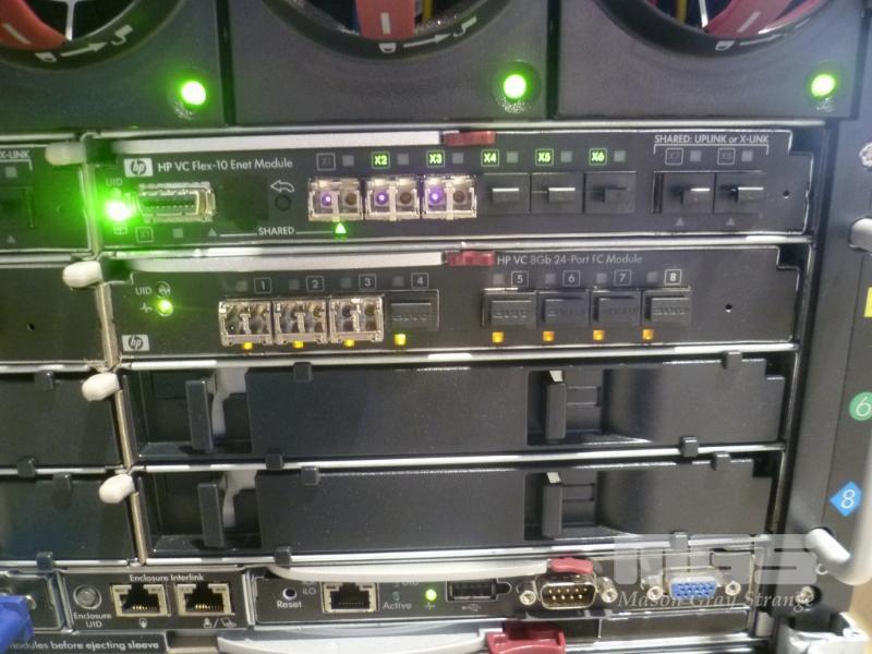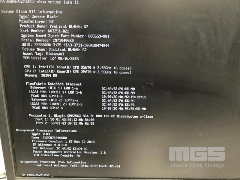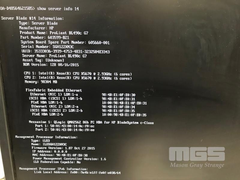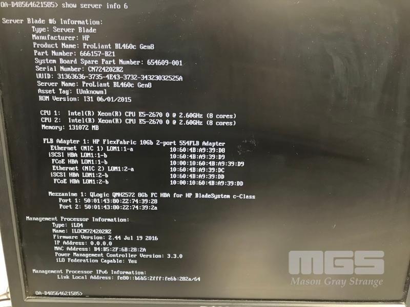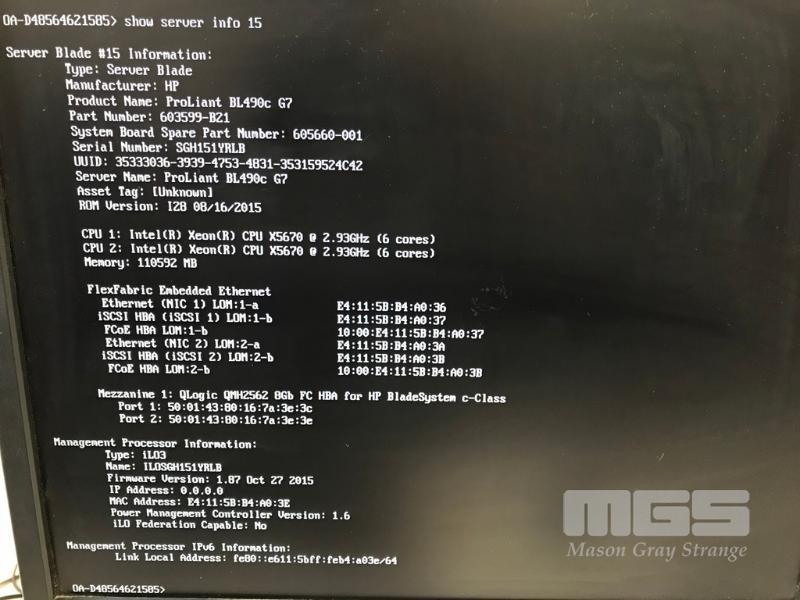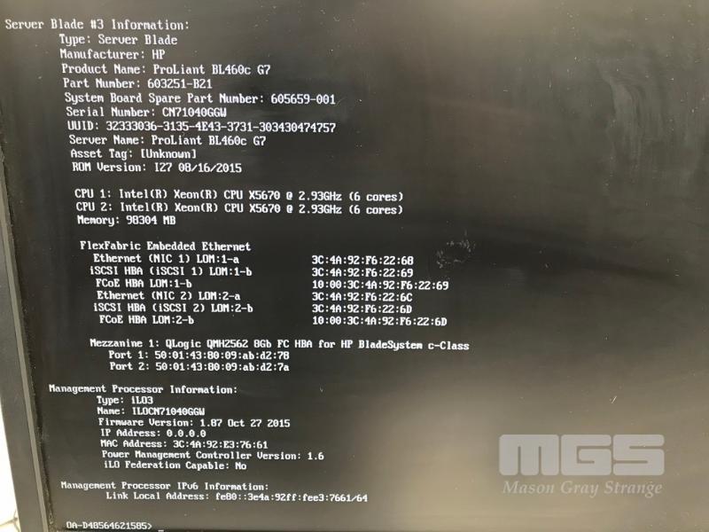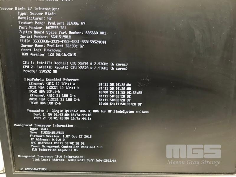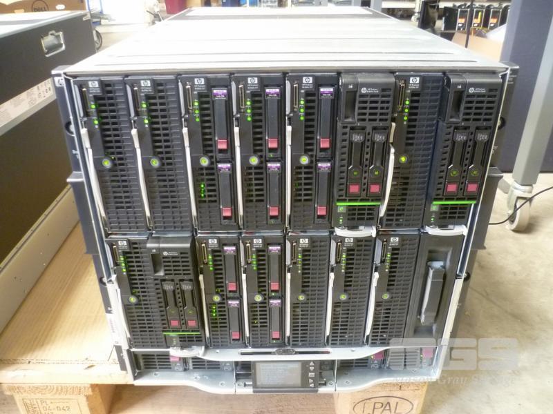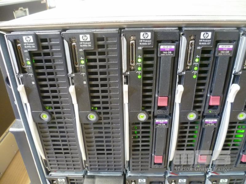 HP BLADESYSTEM c7000 ENCLOSURE G2 (507015-B21) WITH 15 x HP PROLIANT BLADE SERVERS 2 x HP VC 8Gb 24-PORT FC MODULES 2 x HP VC FLEX-10 ENET MODULES WITH RAILS & 15A EXTENSION CABLES #1 - HP PROLIANT BL490c G6, 2 x XEON X5670 @ 2.93GHz, 96GB RAM #2 - HP PROLIANT BL490c G6, 2 x XEON X5670 @ 2.93GHz, 96GB RAM #3 - HP PROLIANT BL460c G7, 2 x XEON X5670 @ 2.93GHz, 96GB RAM, 2 x 146GB HDD #4 - HP PROLIANT BL460c G7, 2 x XEON X5670 @ 2.93GHz, 96GB RAM, 2 x 146GB HDD #5 - HP PROLIANT BL460c G7, 2 x XEON X5670 @ 2.93GHz, 96GB RAM, 2 x 146GB HDD #6 - HP PROLIANT BL460c GEN8, 2 x XEON E5-2670 @ 2.6GHz, 128GB RAM, 2 x 146GB HDD #7 - HP PROLIANT BL490c G7, 2 x XEON X5670 @ 2.93GHz, 108GB RAM #8 - HP PROLIANT BL460c GEN8, 2 x XEON E5-2670 @ 2.6GHz, 128GB RAM, 2 x 146GB HDD #9 - HP PROLIANT BL490c G6, 2 x XEON X5670 @ 2.93GHz, 96GB RAM #10 - HP PROLIANT BL460c GEN8, 2 x XEON E5-2670 @ 2.6GHz, 128GB RAM, 2 x 146GB HDD #11 - HP PROLIANT BL460c G7, 2 x XEON X5670 @ 2.93GHz, 96GB RAM, 2 x 146GB HDD #12 - HP PROLIANT BL460c G7, 2 x XEON X5670 @ 2.93GHz, 96GB RAM, 2 x 146GB HDD #13 - HP PROLIANT BL490c G7, 2 x XEON X5670 @ 2.93GHz, 96GB RAM #14 - HP PROLIANT BL490c G7, 2 x XEON X5670 @ 2.93GHz, 96GB RAM #15 - HP PROLIANT BL490c G7, 2 x XEON X5670 @ 2.93GHz, 108GB RAM EACH WITH QLOGIC QMH2562 / QMH2572 8Gb FC HBA (GEN8s WITH HP FLEXFABRIC 10Gb 2-PORT 554FLB ADAPTER) S/N:SGH043XMP3