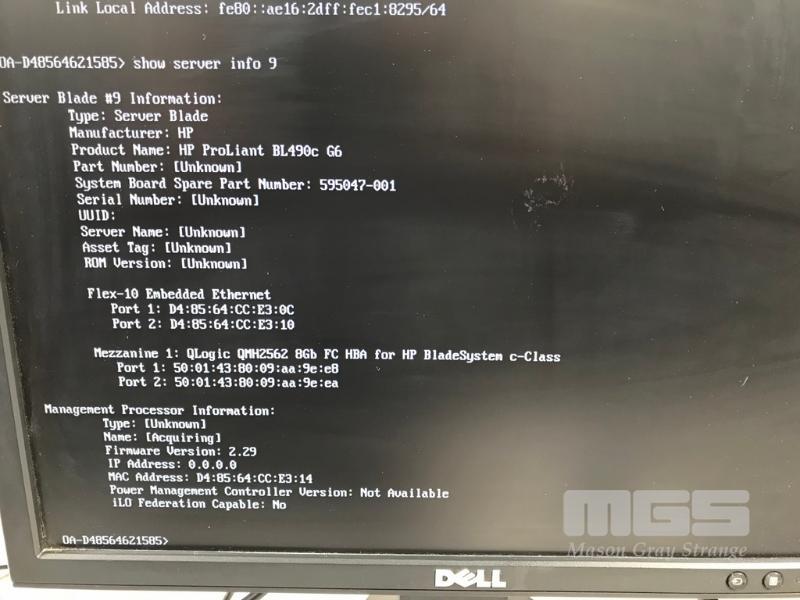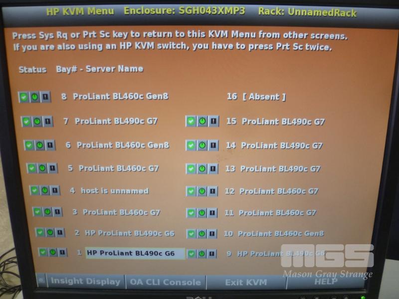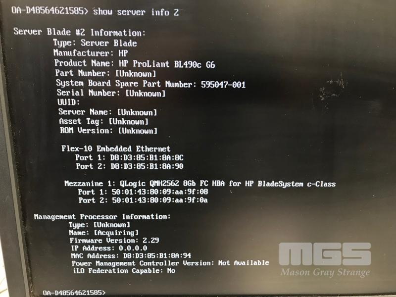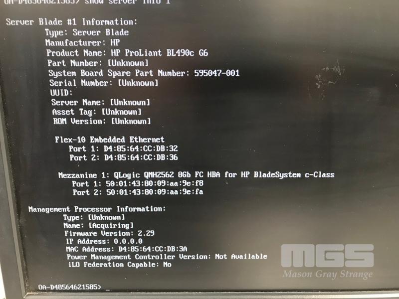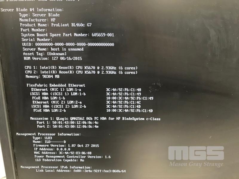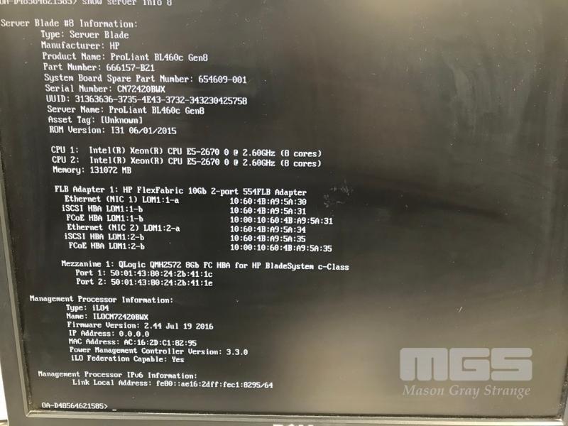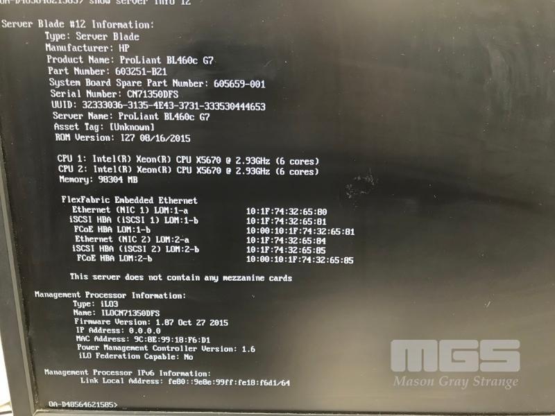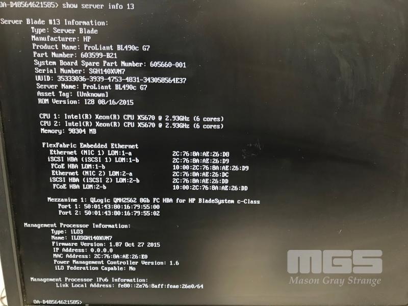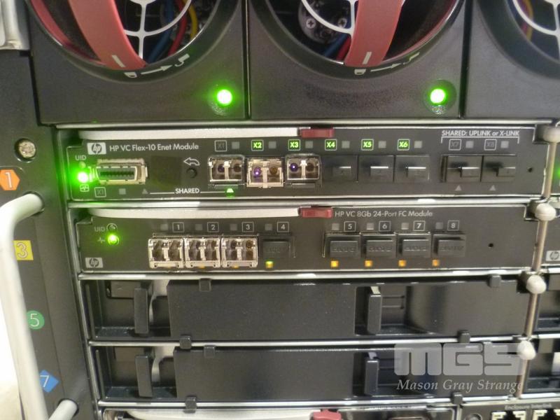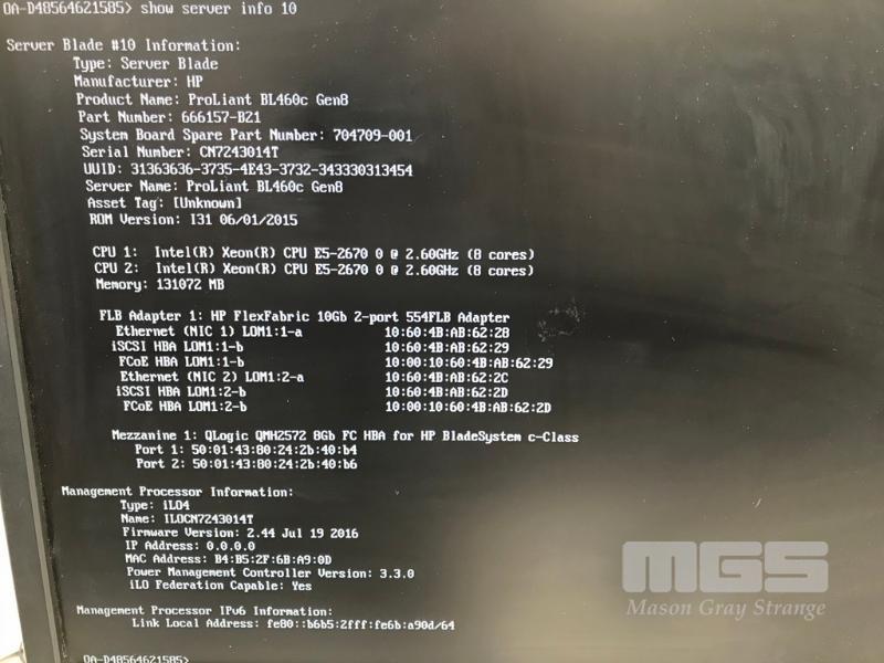HP BLADESYSTEM c7000 ENCLOSURE G2 (507015-B21) WITH 15 x HP PROLIANT BLADE SERVERS 2 x HP VC 8Gb 24-PORT FC MODULES 2 x HP VC FLEX-10 ENET MODULES WITH RAILS & 15A EXTENSION CABLES #1 - HP PROLIANT BL490c G6, 2 x XEON X5670 @ 2.93GHz, 96GB RAM #2 - HP PROLIANT BL490c G6, 2 x XEON X5670 @ 2.93GHz, 96GB RAM #3 - HP PROLIANT BL460c G7, 2 x XEON X5670 @ 2.93GHz, 96GB RAM, 2 x 146GB HDD #4 - HP PROLIANT BL460c G7, 2 x XEON X5670 @ 2.93GHz, 96GB RAM, 2 x 146GB HDD #5 - HP PROLIANT BL460c G7, 2 x XEON X5670 @ 2.93GHz, 96GB RAM, 2 x 146GB HDD #6 - HP PROLIANT BL460c GEN8, 2 x XEON E5-2670 @ 2.6GHz, 128GB RAM, 2 x 146GB HDD #7 - HP PROLIANT BL490c G7, 2 x XEON X5670 @ 2.93GHz, 108GB RAM #8 - HP PROLIANT BL460c GEN8, 2 x XEON E5-2670 @ 2.6GHz, 128GB RAM, 2 x 146GB HDD #9 - HP PROLIANT BL490c G6, 2 x XEON X5670 @ 2.93GHz, 96GB RAM #10 - HP PROLIANT BL460c GEN8, 2 x XEON E5-2670 @ 2.6GHz, 128GB RAM, 2 x 146GB HDD #11 - HP PROLIANT BL460c G7, 2 x XEON X5670 @ 2.93GHz, 96GB RAM, 2 x 146GB HDD #12 - HP PROLIANT BL460c G7, 2 x XEON X5670 @ 2.93GHz, 96GB RAM, 2 x 146GB HDD #13 - HP PROLIANT BL490c G7, 2 x XEON X5670 @ 2.93GHz, 96GB RAM #14 - HP PROLIANT BL490c G7, 2 x XEON X5670 @ 2.93GHz, 96GB RAM #15 - HP PROLIANT BL490c G7, 2 x XEON X5670 @ 2.93GHz, 108GB RAM EACH WITH QLOGIC QMH2562 / QMH2572 8Gb FC HBA (GEN8s WITH HP FLEXFABRIC 10Gb 2-PORT 554FLB ADAPTER) S/N:SGH043XMP3