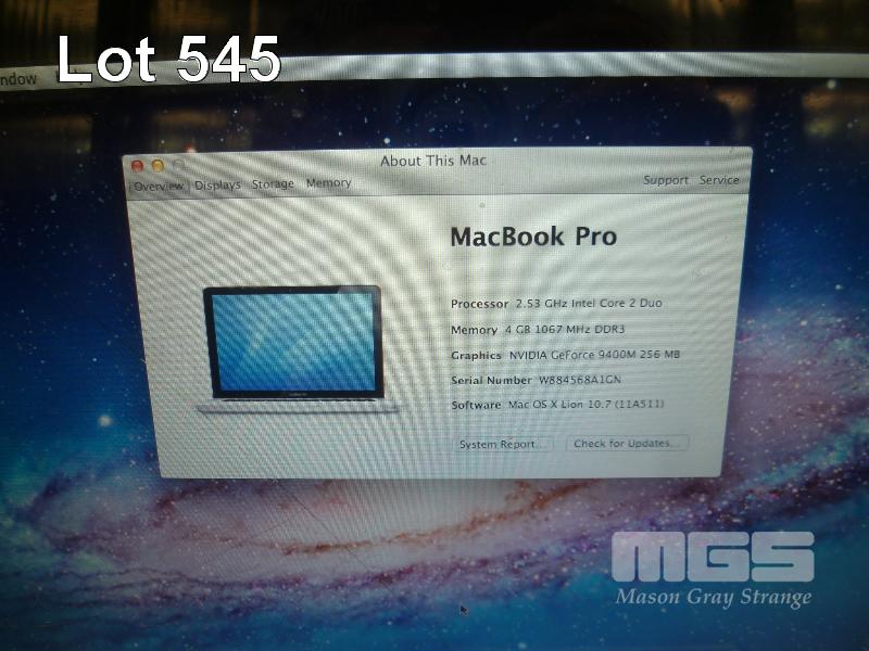 LAPTOP, APPLE MACBOOK (A1286), CORE 2 DUO T9400 @ 2.53GHz, 4GB DDR3 RAM, 320GB SATA HDD, DVD-RW, 15" WIDESCREEN (1440x900), 256MB NVIDIA GEFORCE 9400M VIDEO, Wi-Fi, MAC OS 10.7 INSTALLED (DAMAGE TO CASING, CRACKED SCREEN) (NO POWER SUPPLY) S/N:W884568A1GN