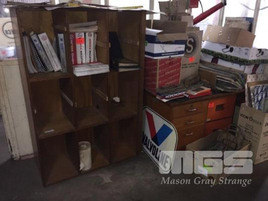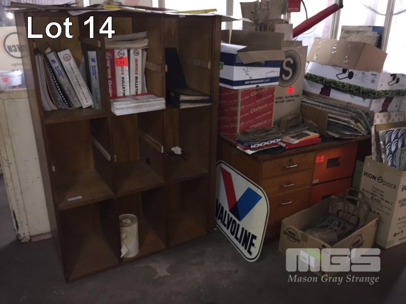 FILING CABINET, 2 DRAWER, ORANGE STEEL, TIMBER DESK, 140 x 40cm, 9 HOLE PIGEON HOLE UNIT, 153 x 110cm
