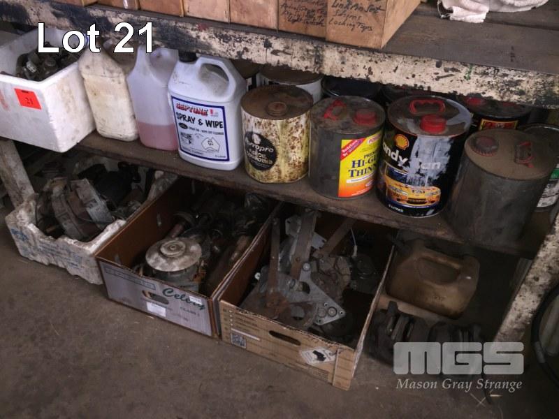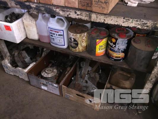 CANS ASSORTED THINNERS, CLEANERS, 4 x BOXES AUTOMOTIVE PARTS, STARTER MOTORS, ALTERNATORS, ETC, (MIDDLE SHELF & FLOOR)