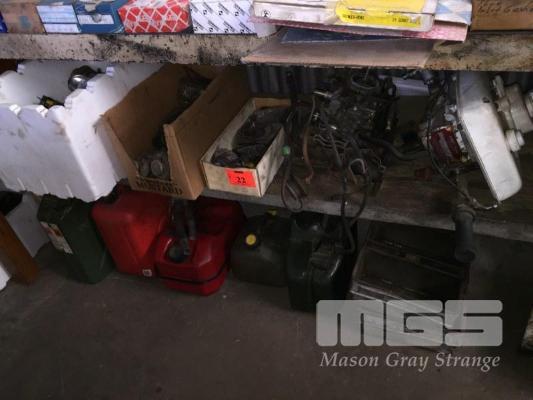 5 x JERRY CANS, KIRBY TECUMSEH, 2 STROKE ENGINE MODEL- KAV87, 3 x BOXES ASSORTED AUTOMOTIVE PARTS, ETC, (MIDDLE SHELF & FLOOR)