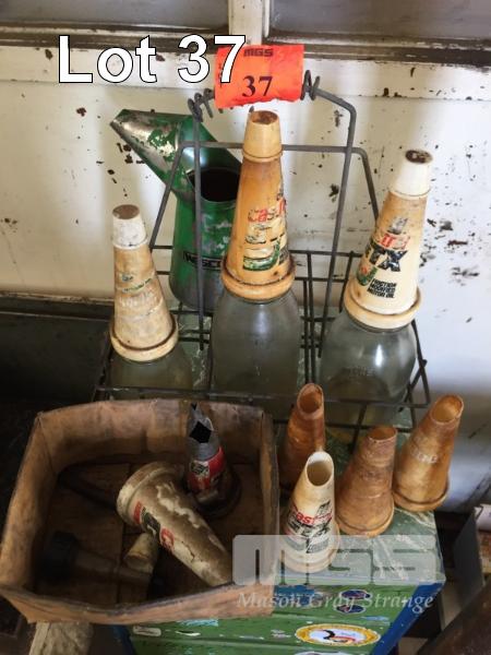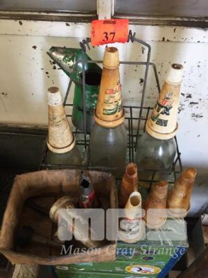 COLLECTABLE OIL GLASS BOTTLES & WIRE BASKET WITH PLASTIC CAPS, CASTROL