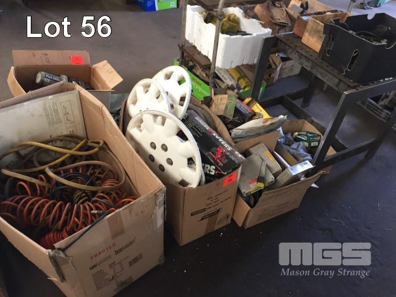 7 x BOXES ASSORTED AUTOMOTIVE PARTS, ECU'S, HUB CAPS, BRAKE SHOE LINERS, AIR HOSES, ETC