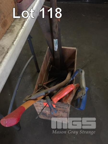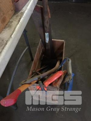 ASSORTED HAND TOOLS, AXE, HAND SAW, HATCHET, SLEDGE HAMMER, ETC, 1 x BOX