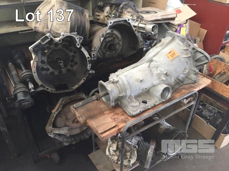 6 x ASSORTED AUTOMATIC TRANSMISSIONS, 3 x TROLLEYS, WORK BENCH WITH PIGEON HOLE UNIT, 140 x 80cm