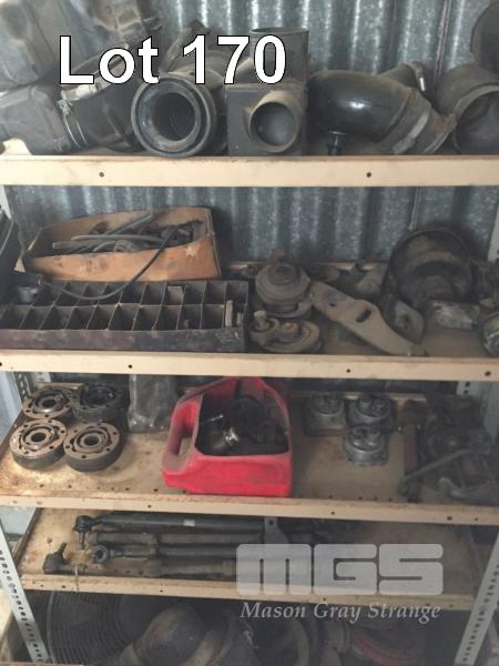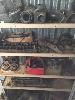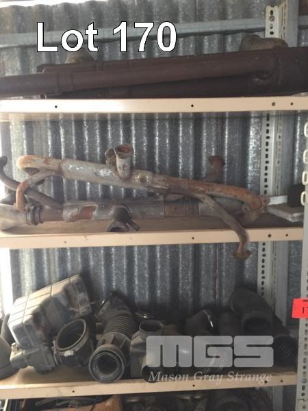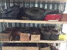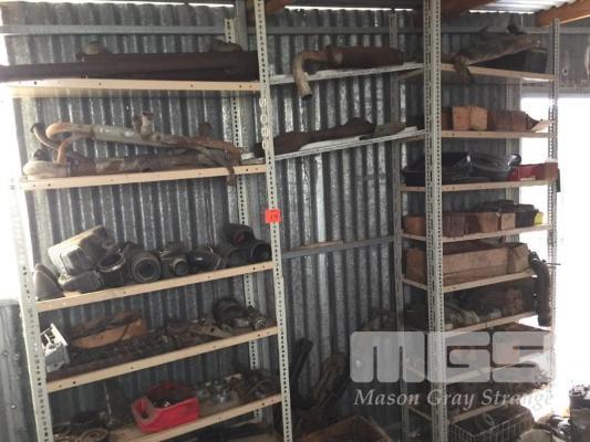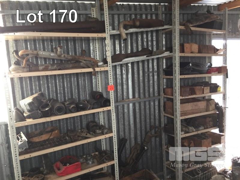 16 x SHELVES AUTOMOTIVE COMPONENTS, MANIFOLDS, EXHAUST PIPES, SUSPENSION ARMS, STARTER MOTORS, AUTO TRANS COMPONENTS, ETC, 2 x BAYS