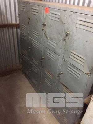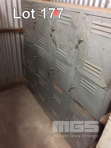 2 x LOCKER UNITS, GREY STEEL, 12 COMPARTMENT, 155 x 40cm & 180 x 123cm WITH 4 x SINGLE DOORS