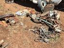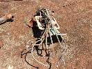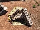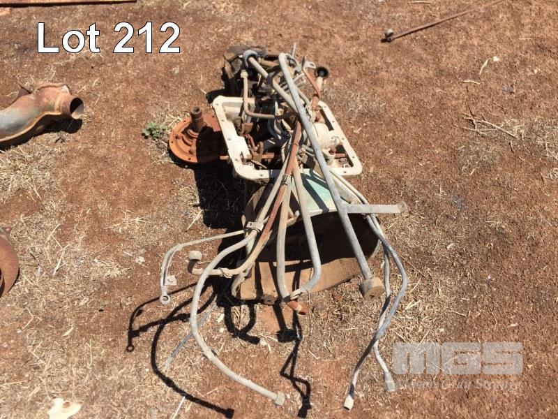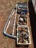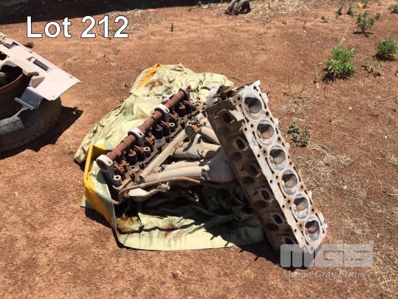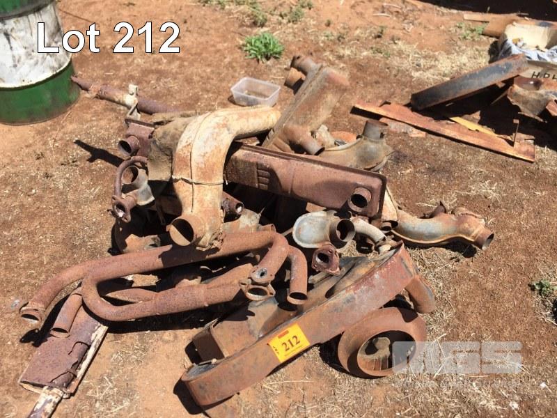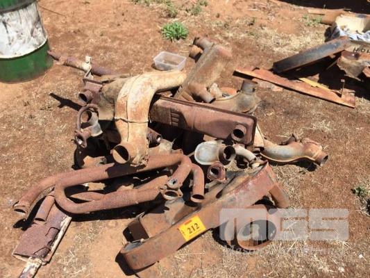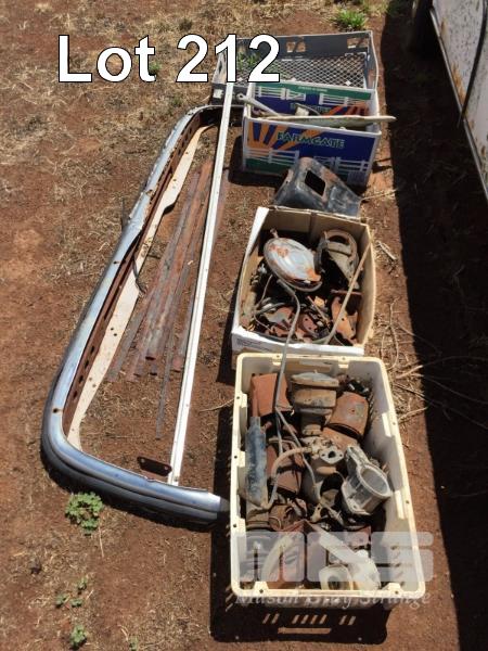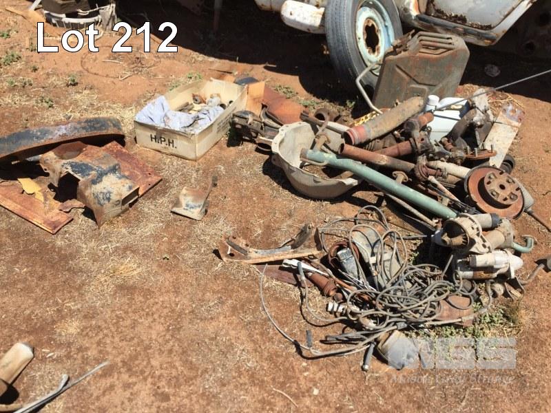 QUANTITY ASSORTED AUTOMOTIVE PARTS ON GROUND, NEAR KOMBI VANS, EXHAUSTS, CYLINDER HEADS, SUSPENSION PARTS, ETC, SUIT VW