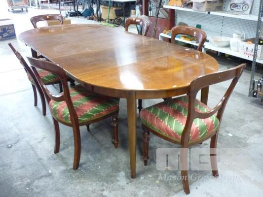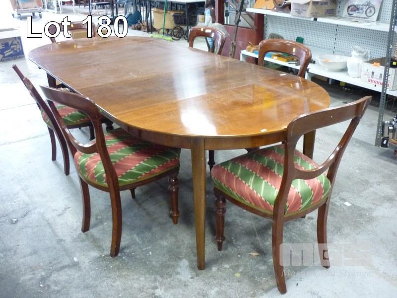 POLISHED TIMBER, 7 PIECE DINING SUITE, ROUND EXTENSION TABLE, 3 x LEAF, 6 x TIMBER/FABRIC DINING CHAIRS (1 x ALL FAULTS)