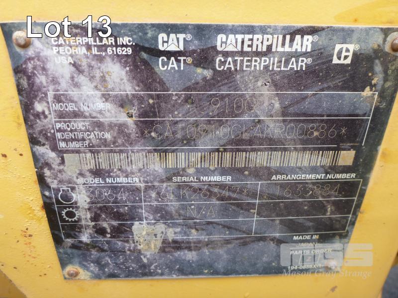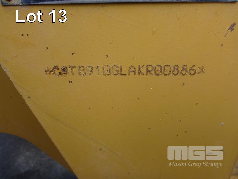 CAT 910G 4x4 ARTICULATED LOADER PIN: CAT0910GLAKR00886 HOURS: 60 hours INDICATED CAT, 4 CYLINDER TURBO DIESEL, DOM: UNKNOWN RED DOT AC, ROPS H16 CAB CD, HAZARD LIGHT ISOLATOR 225cm TRIM BUCKET 60mm PIN 24" RIMS, REAR PIN HITCH KEY #65 (NO PAPERS, NO OWNER'S MANUAL, NO SERVICE BOOKS) CONDITION: - RUST EVIDENT IN CAB & DOORS RIGHT HAND MIRROR - BROKEN ROOF LINING - DETACHING