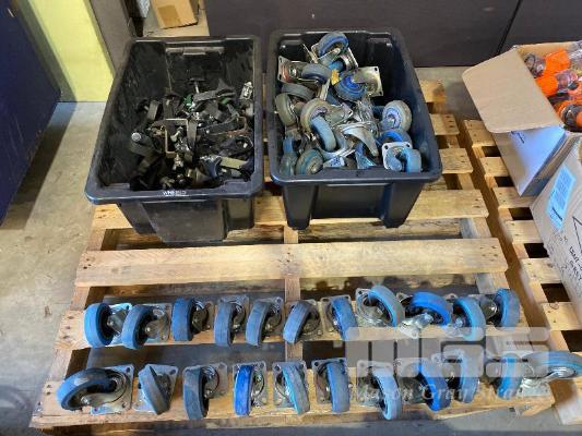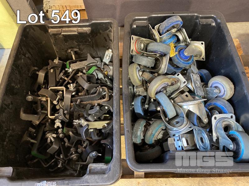 1 x TUB OF APPROX 50 CASTOR WHEELS, 1 x TUB OF HOOK CLAMPS