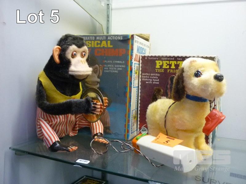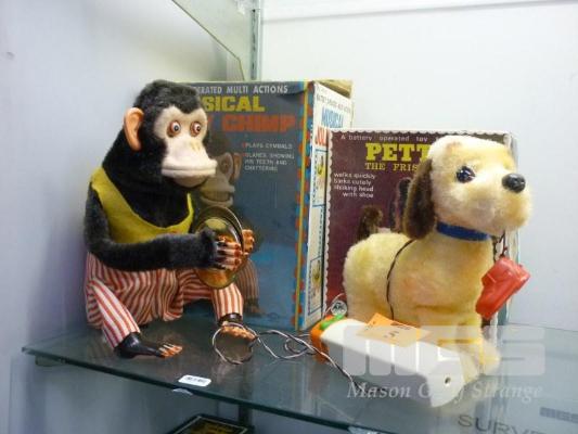 VINTAGE TOYS, BATTERY OPERATED MUSICAL JOLLY CHIMP, WITH ORIGINAL PACKAGING & BATTERY OPERATED PETTIE THE FRISKY PUP, WITH ORIGINAL PACKAGING