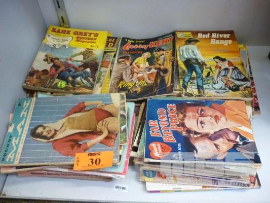 ASSORTED RETRO POCKET BOOKS & COMIC BOOKS INCLUDING WESTERNS, ROMANCE, ETC